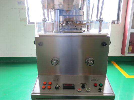 The machine is a double-pressing automatically revolving piece-pressing machine which could make grain be pressed to be round piece ,be carved characters ,special shapes and double color piece prescription .It is mainly used in manufacturing piece prescription for pharmaceutical industry enterprises like chemical industry ,foods,electronics.(Note: when manufacturing double color piece ,it only need replacing components and adding powder absorbing apparatus which greatly lowers the cost .