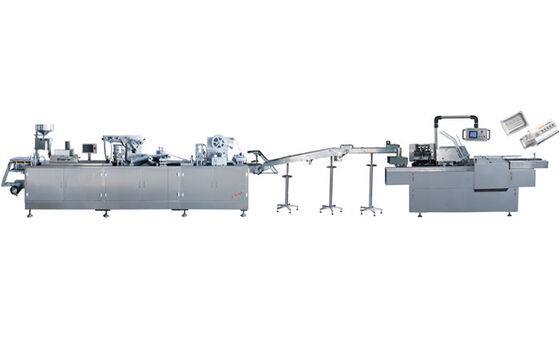 This machine is suitable for automatic feeding product of multi-variety multi-specifications into carton (either for blister or bottle).Adjust automatic feeding structure conveniently,setup quantity of blisters on touch screen randomly. On line product feeding and detecting,leaflet fold(1-4folds) and feeding,leaflet detecting,canton opening and forming,products and leaflet pushing into carton,printing batch number,sealing carton with tuck-in or hot melt glue device. Automatically reject lacking of leaflet or prodcut and finished product out.